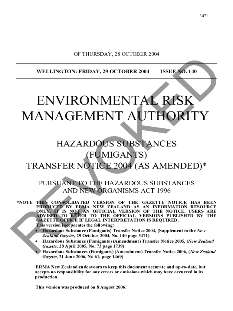 3471OF THURSDAY, 28 OCTOBER 2004O KED WELLINGTON: FRIDAY, 29 OCTOBER 2004 ISSUE NO. 140ENVIRONMENTAL RISK MANAGEMENT AUTHORITY HAZARDOUS SUBSTANCES (FUMIGANTS) TRANSFER NOTICE 2004 (AS AMENDED)*R