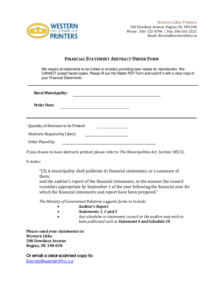 Western Lithe Printers 300 Dewey Avenue, Regina, SK S4N 038 Phones: 306 5258796 | Fax: 3065652525 Email: Brenda@westernlitho.caFINANCIAL STATEMENT ABSTRACT ORDER FORM We require all statements to