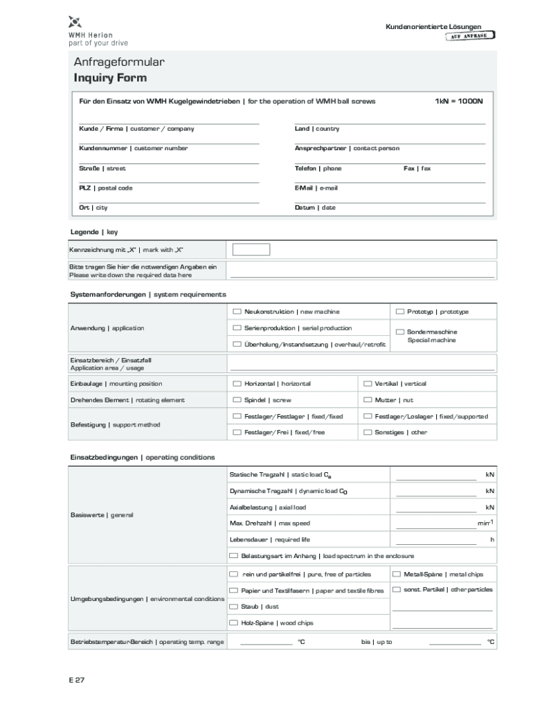 For den Ersatz on WMD Kugelgewindetrieben | for the operation of WMD ball screwsKunde / Firm | customer / company Land | countryKundennummer