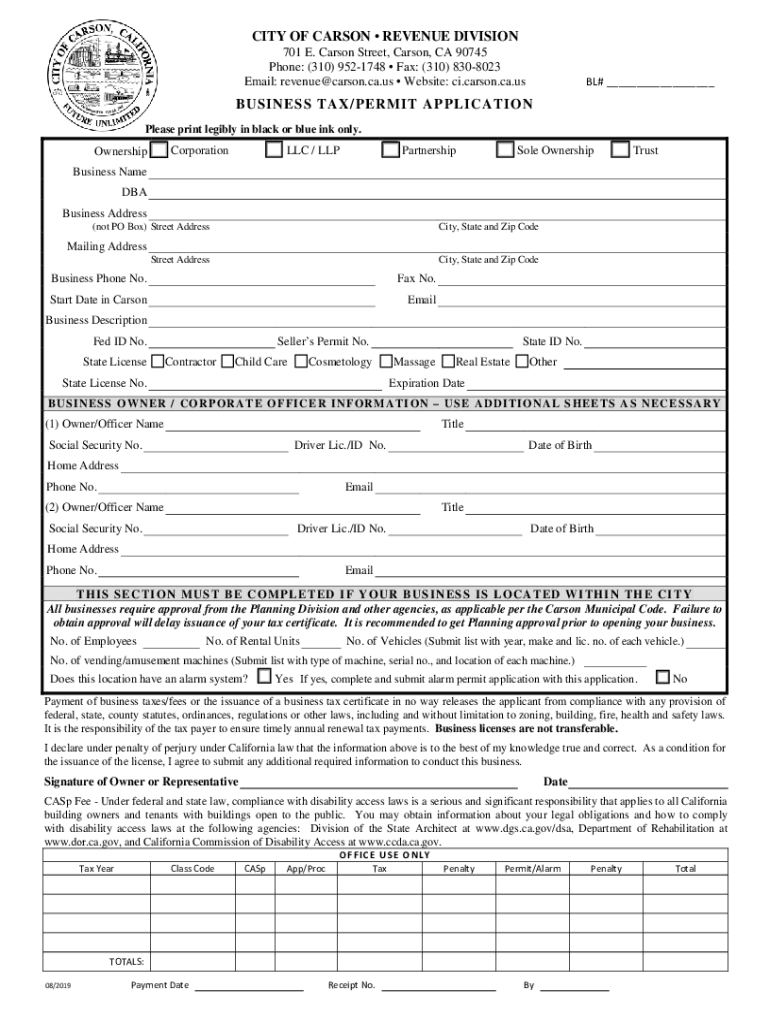 Get the free 2019-2023 Form CA Business Tax/Permit Application ... - ci carson ca