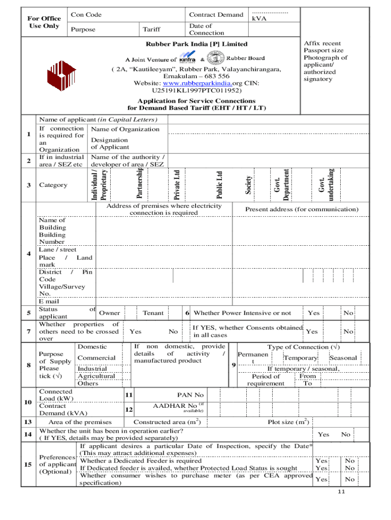 For Office Use Only Code................... contract DemandPurposeDate of ConnectionTariffRubber Park India [P] Limited(2A, Kautileeyam, Rubber Park, Valayanchirangara, Vernacular 683 556 Website: