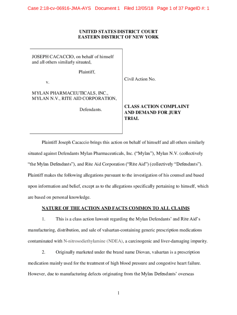 Case 2:18cv06916JMAAYS Document 1 Filed 12/05/18-Page 1 of 37 Paged #: 1UNITED STATES DISTRICT COURT EASTERN DISTRICT OF NEW YORKJOSEPH CARPACCIO, on behalf of himself and all others similarly situated,