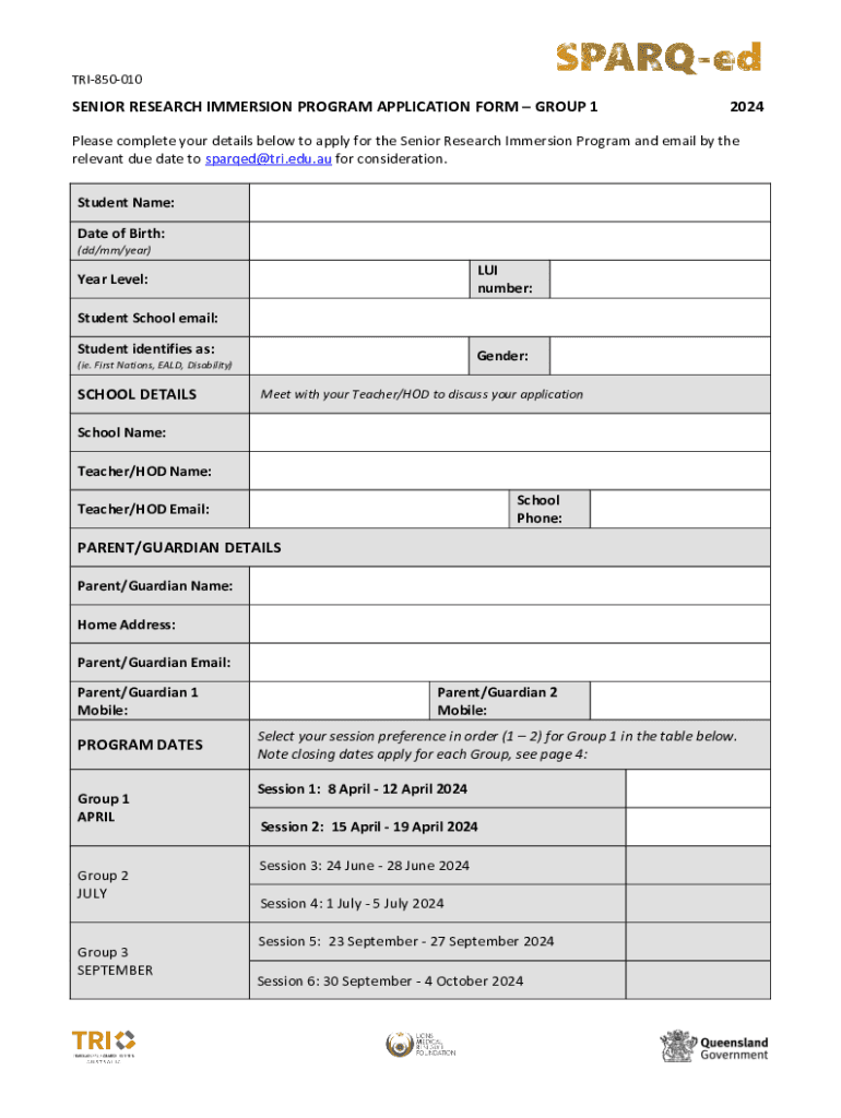 TRI850010SENIOR RESEARCH IMMERSION PROGRAM APPLICATION FORM GROUP 12024Please complete your details below to apply for the Senior Research Immersion Program and email by the relevant due date to sparqed@tri.edu.au