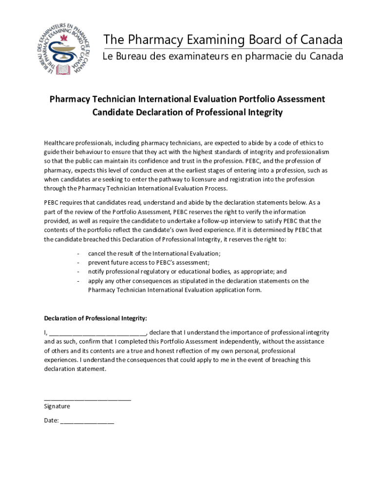 The Pharmacy Examining Board of Canada Le Bureau DES examinations en pharmacies Du CanadaPharmacy Technician International Evaluation Portfolio Assessment Candidate Declaration of Professional Integrity
