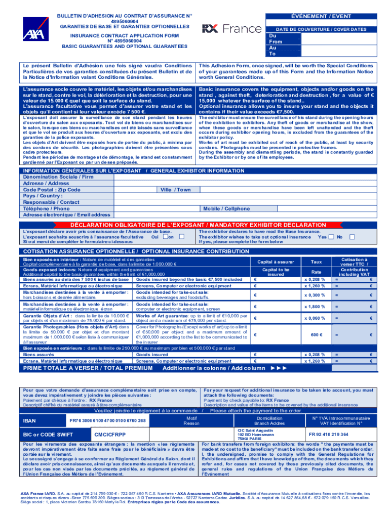 ELEMENT / EVENTBULLETIN ADHESION AU CONTRACT ASSURANCE N 4895060904 GUARANTIES DE BASE ET GUARANTIES OPTIONNELLESDATE DEC OUVERTURE / COVER DATES Du From Au Coinsurance CONTRACT APPLICATION FORM N