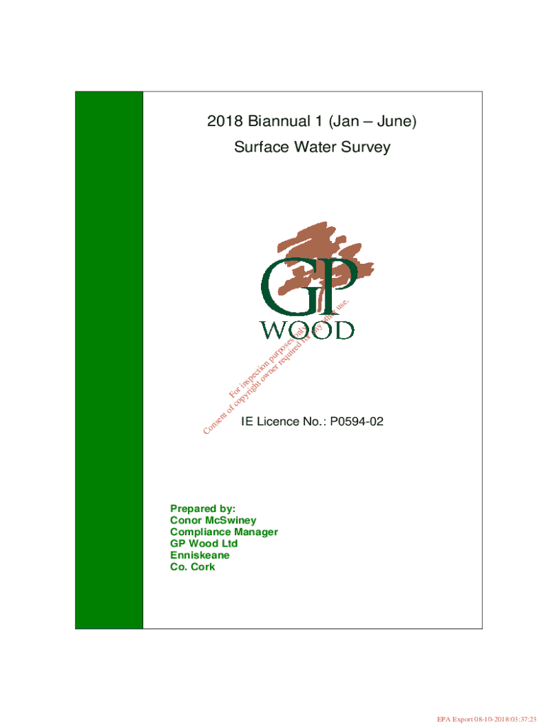 2018 Biannual 1 (Jan June)Cons into f c FO op r i yr NS IG PE ht ct ow ion né PU r RP EQ OS UI BS re o d NL for y. Ra nyotheruse. Surface Water Survey IE License No.: P059402Prepared by: Conor Messina