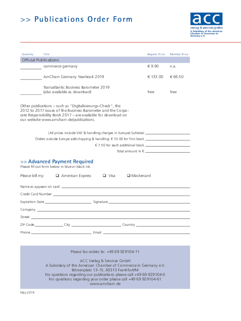 Publications Order Form A Subsidiary of the American Chamber of Commerce in Germany e.V. QuantityTitleRegular Remember Price commerce Germany 9.90n.a. ADCAM Germany Yearbook 2019 133.00 66.50Transatlantic