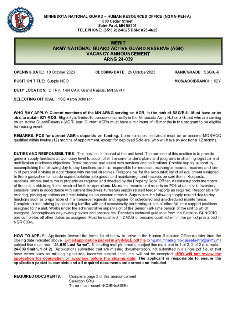MINNESOTA NATIONAL GUARD HUMAN RESOURCES OFFICE (NGMNPEHA) 600 Cedar Street Saint Paul, MN 55101 TELEPHONE: (651) 2824625 DSN: 8254625MERIT ARMY NATIONAL GUARD ACTIVE GUARD RESERVE (AGR) VACANCY ANNOUNCEMENT