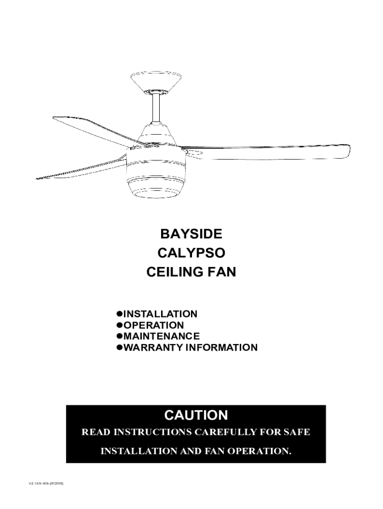 BAYSIDE CALYPSO CEILING FAN INSTALLATION OPERATION MAINTENANCE WARRANTY INFORMATIONCAUTION READ INSTRUCTIONS CAREFULLY FOR SAFE INSTALLATION AND FAN OPERATION. V2.1 EN WS(07/2018)Calypso Installation