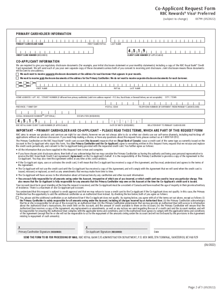 Applicant Request Form RBC Rewards Visa Preferred (subject to change)03799 (05/2022)Annual Purchases: 19.99% Interest Rate Cash advances: 22.99% (21.99% if you reside in Quebec)Interested Grace PeriodMinimum
