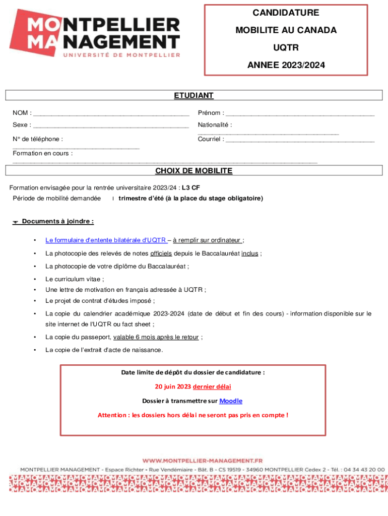 CANDIDATURE MOBILITY AU CANADA UQTR ANNE 2023/2024ETUDIANT NOT : ___Prom : ___See : ___Nationalist : ___ Courier : ___N de phone : ___ Formation enc ours : ___CHOIR DE MOBILITY Formation envisage