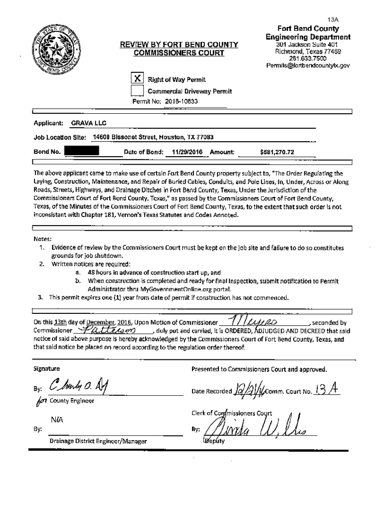 13AFort Bend County Engineering Department REVIEW BY FORT BEND COUNTY COMMISSIONERS COURT301 Jackson Suite 401Richmond, Texas 77469 261.633.7500Permlts@fortbendcountytx.gov Right of Way Permit Commercial