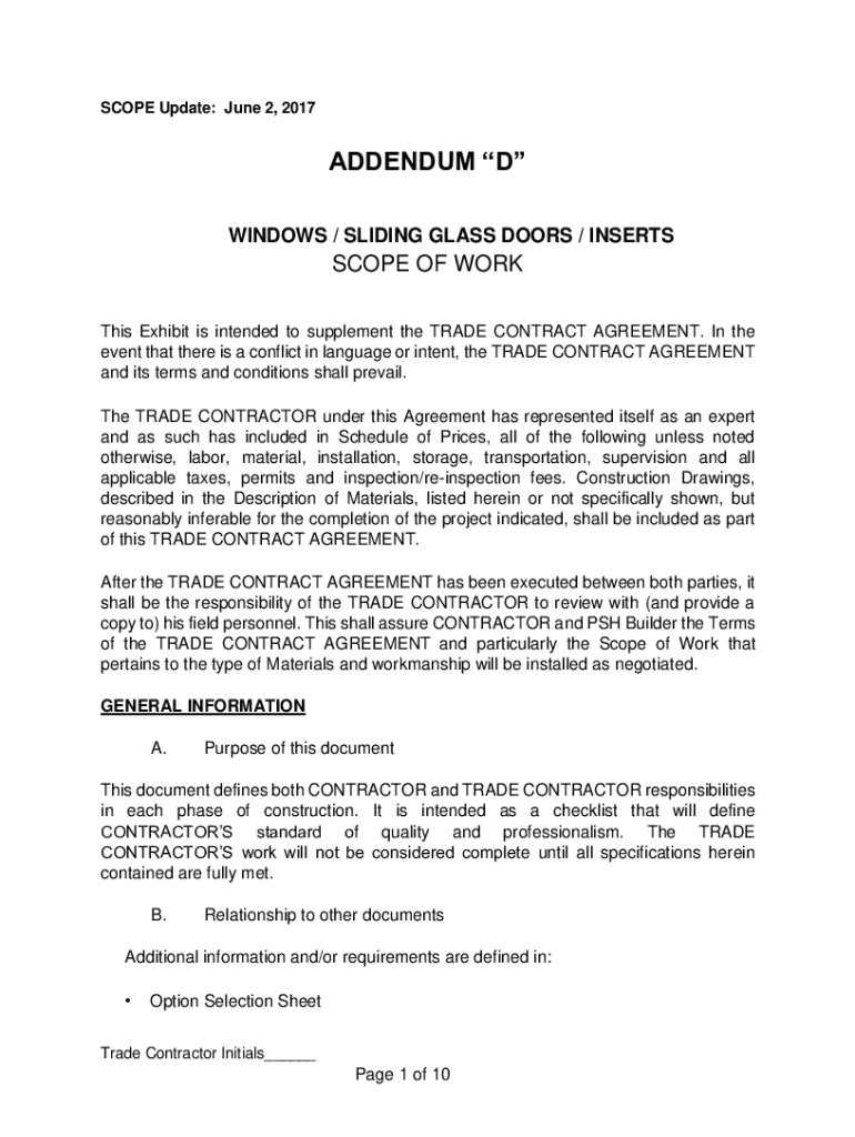 SCOPE Update: June 2, 2017ADDENDUM D WINDOWS / SLIDING GLASS DOORS / INTERSCOPE OF WORK This Exhibit is intended to supplement the TRADE CONTRACT AGREEMENT. In the event that there is a conflict in