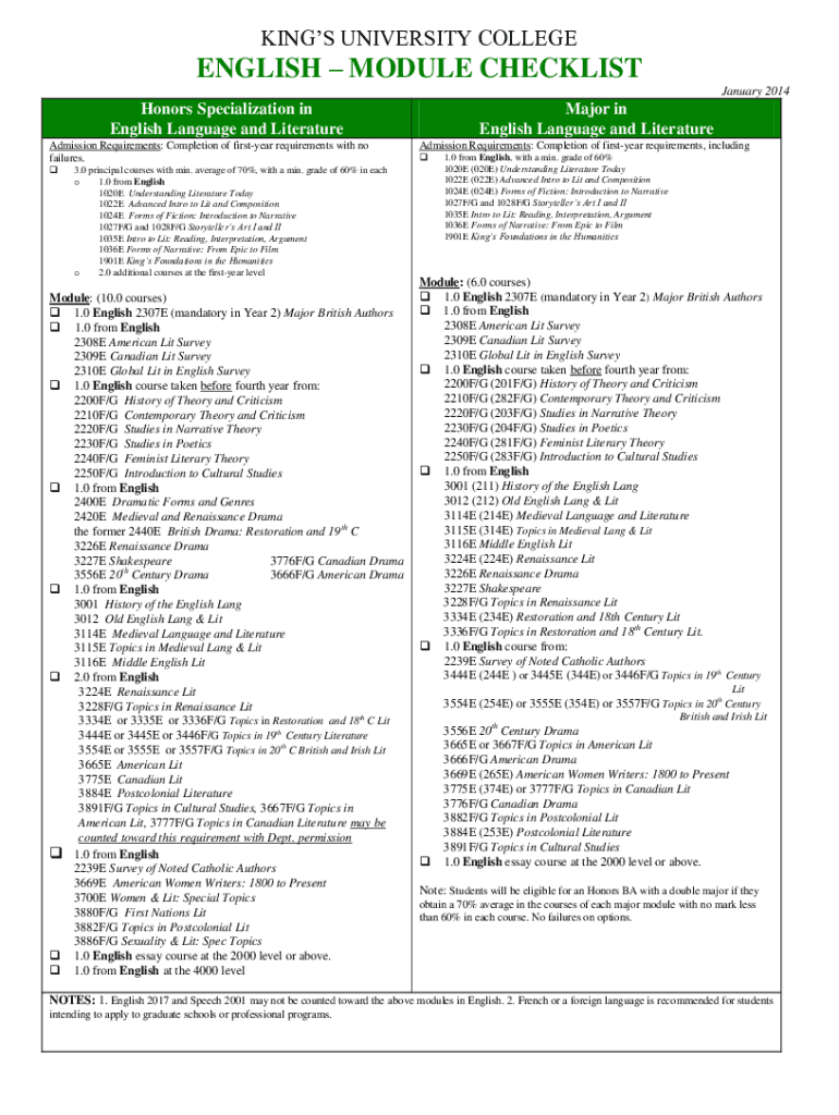 KINGS UNIVERSITY COLLEGEENGLISH MODULE CHECKLIST January 2014Honors Specialization in English Language and Literature Admission Requirements: Completion of first year requirements with no failures.