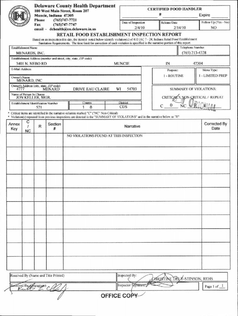Delaware County Health Department 100 West Main Street, Room 207 Muncie, Indiana 47305 Phone(765)7477721 Fax(765)7477747 email dchealth@co.delaware.in.usCERTIFIED FOOD HANDLER Expire Date of InspectionFollow