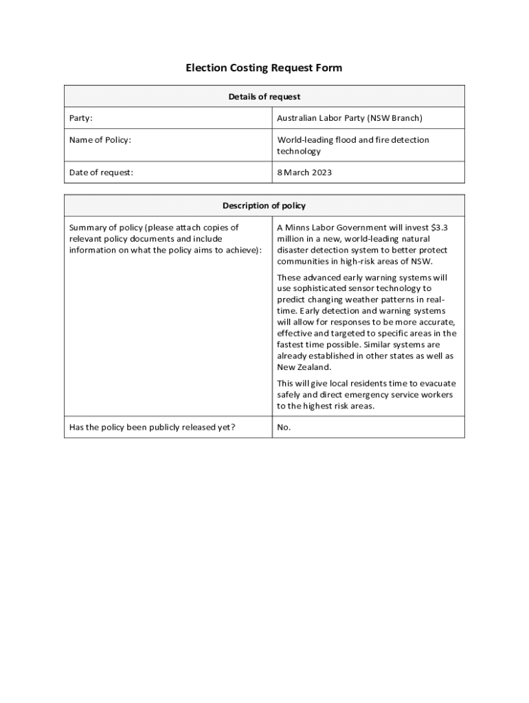 Election Costing Request Form Details of request Party:Australian Labor Party (NSW Branch)Name of Policy:World leading flood and fire detection technologyDate of request:8 March 2023Description of