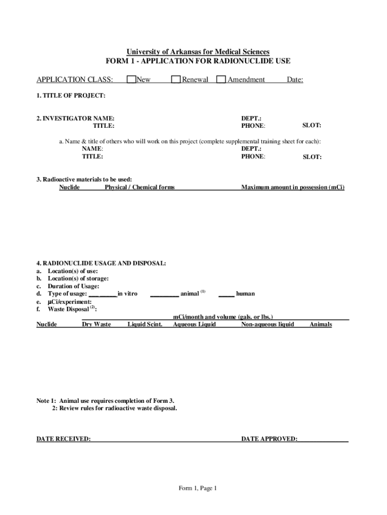 University of Arkansas for Medical Sciences FORM 1 APPLICATION FOR RADIONUCLIDE USE APPLICATION CLASS:[ ] New[ ] Renewal[ ] AmendmentDate:1. TITLE OF PROJECT:2. INVESTIGATOR NAME: TITLE:DEPT.: PHONE:SLOT:a.