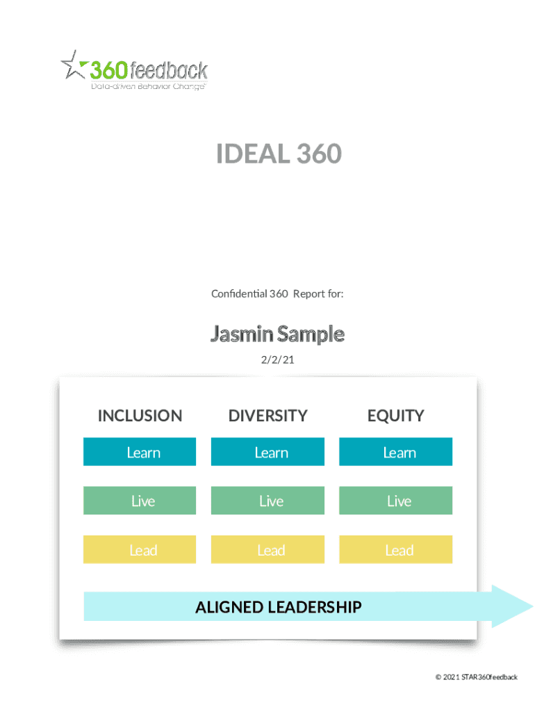 IDEAL 360Conden\'all 360 Report for:Jasmin Sample 2/2/21INCLUSIONDIVERSITYEQUITYLearnLearnLearnLiveLiveLiveLeadLeadLeadALIGNED LEADERSHIP 2021 STAR360feedbackWhat\'s In This Report Pageboy Feedback