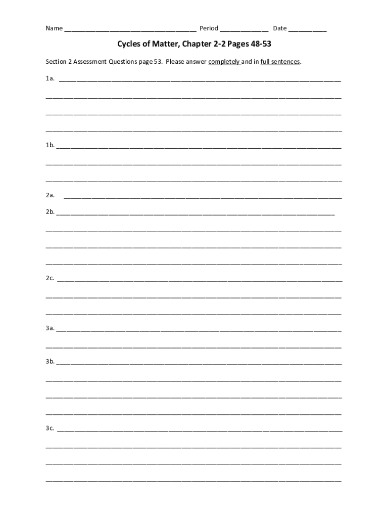 Name ___ Period ___ Date ___Cycles of Matter, Chapter 22 Pages 4853 Section 2 Assessment Questions page 53. Please answer completely and in full sentences. 1a. ___ ___ ___ ___ 1b. ___ ___ ___ 2a.___2b.