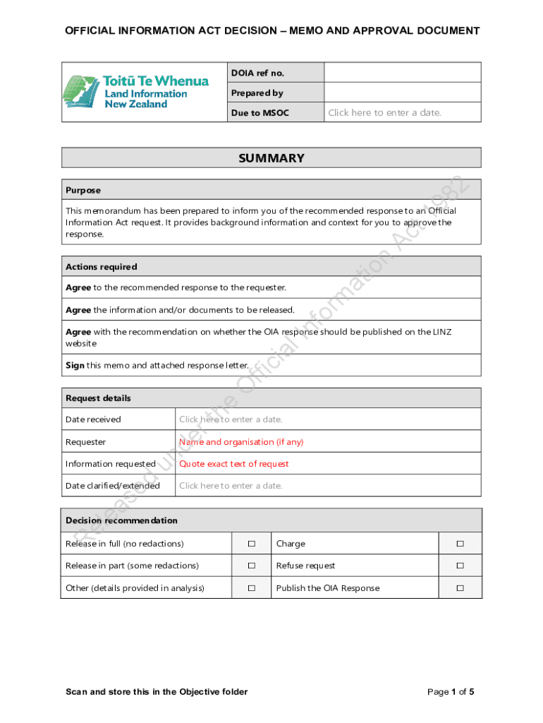 OFFICIAL INFORMATION ACT DECISION MEMO AND APPROVAL DOCUMENTARIAN ref no. Prepared click here to enter a date. Due to MSOCSUMMARY982PurposenAct1This memorandum has been prepared to inform you of the