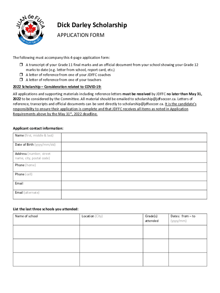 Dick Darla Scholarship 2022 APPLICATION PROCESS and ELIGIBILITY Criteria Dick Darla Scholarship is a memorial scholarship in the amount of $500 which may be awarded by the Juan de Fuca Football Club
