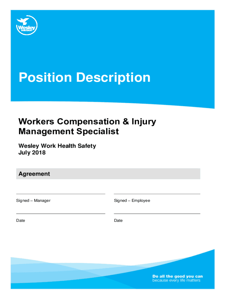 Position DescriptionWorkers Compensation & Injury Management Specialist Wesley Work Health Safety July 2018AgreementSigned ManagerSigned EmployeeDateDateWorkers Compensation & Injury Management SpecialistManagers