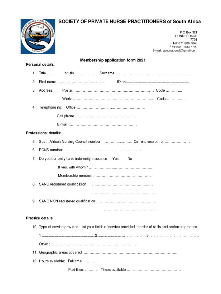 SOCIETY OF PRIVATE NURSE PRACTITIONERS of South Africa P O Box 321 RONDEBOSCH 7701 Tel: 071 806 1640 Fax: (021) 683 7799 Email: spnpnational@gmail.comMembership application form 2021 Personal details: