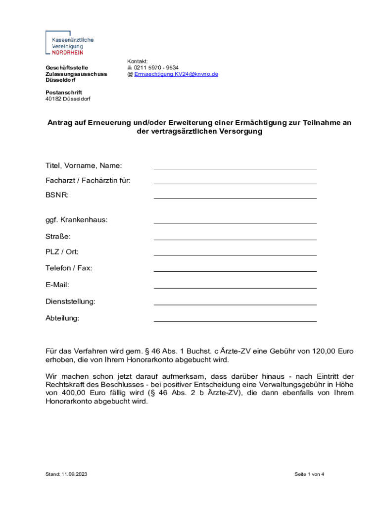 Geschftsstelle Zulassungsausschuss DsseldorfKontakt: 0211 5970 9534 @ Ermaechtigung.KV24@knvno.dePostanschrift 40182 DsseldorfAntrag AUF Erneuerung UND/Oder Erweiterung anger Ermchtigung our Mallarme