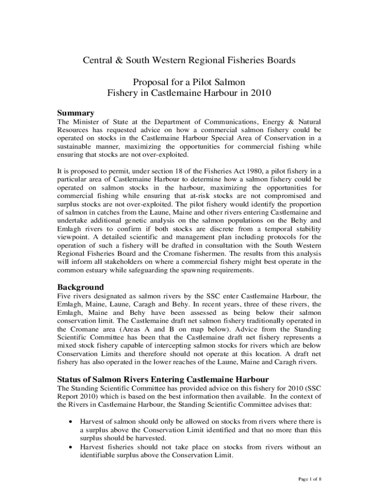 Central & South Western Regional Fisheries Boards Proposal for a Pilot Salmon Fishery in Castlemaine Harbor in 2010 Summary The Minister of State at the Department of Communications, Energy & Natural
