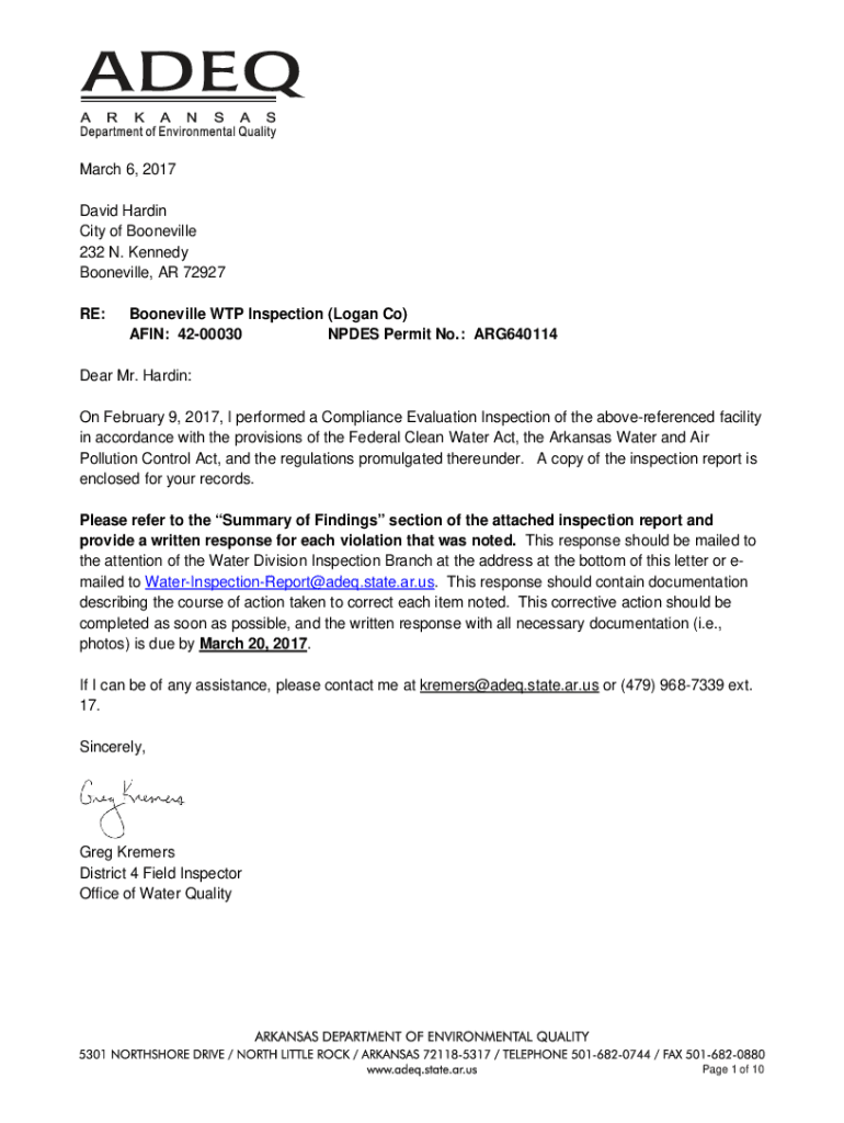 March 6, 2017, David Hardin City of Bonneville 232 N. Kennedy Bonneville, AR 72927 RE:Bonneville WTP Inspection (Logan Co) AKIN: 4200030 NODES Permit No.: ARG640114Dear Mr. Hardin: On February 9,