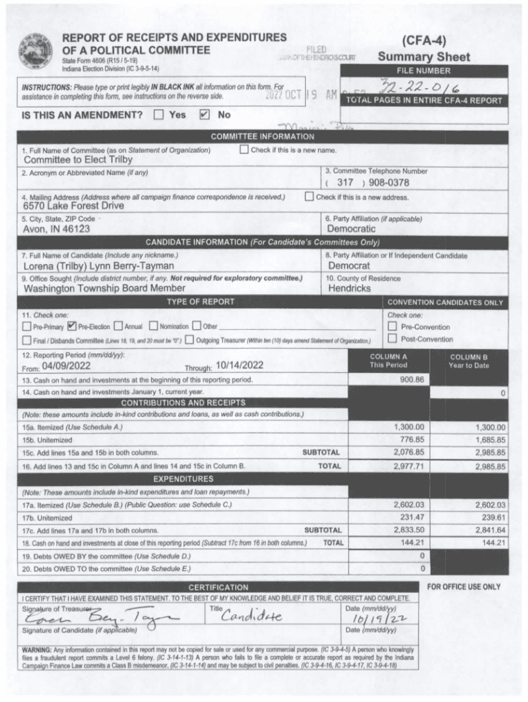 REPORT OF RECEIPTS AND EXPENDITURES OF A POLITICAL COMMITTEE(CFA4) Summary SheetHUDState Form4606(R15/519) Indiana Election Division (1C 39514)FILE NUMBERINSTRUCTIONS: Please type or print legibly