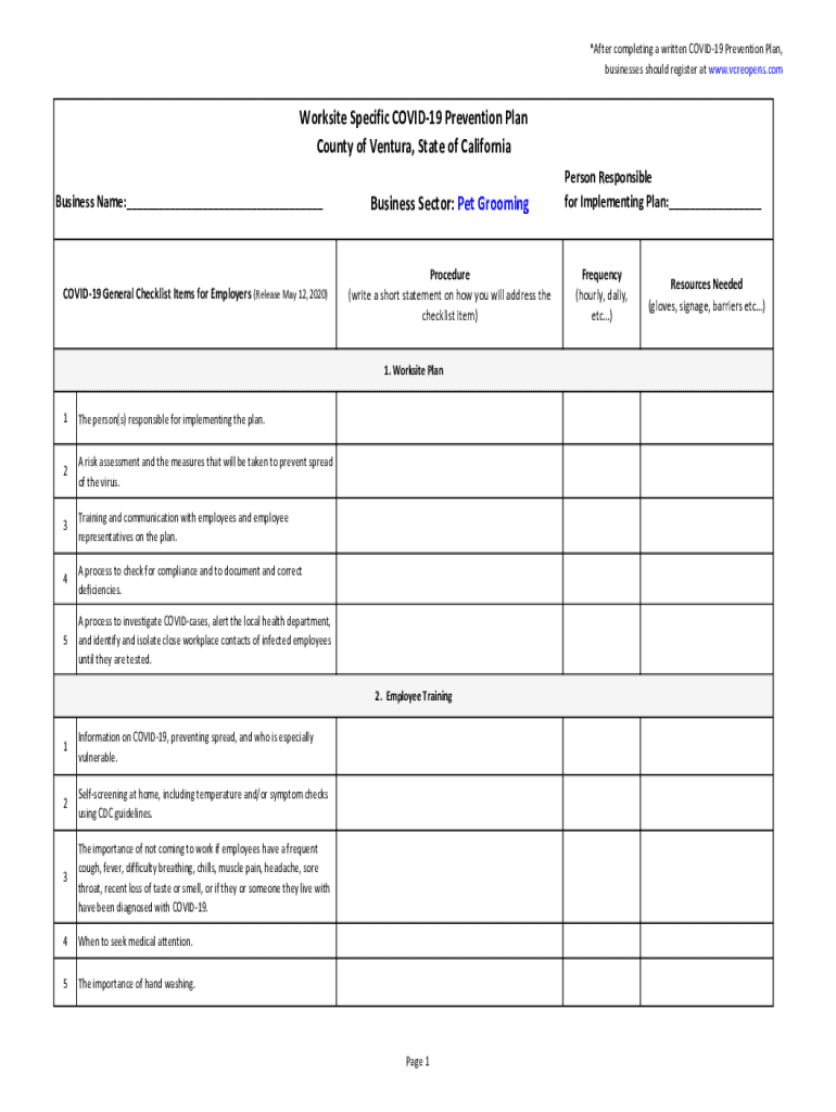 *After completing a written COVID-19 Prevention Plan, businesses should register at www.vcreopens.comWorksite Specific COVID-19 Prevention Plan County of Ventura, State of California Business Name:___COVID-19