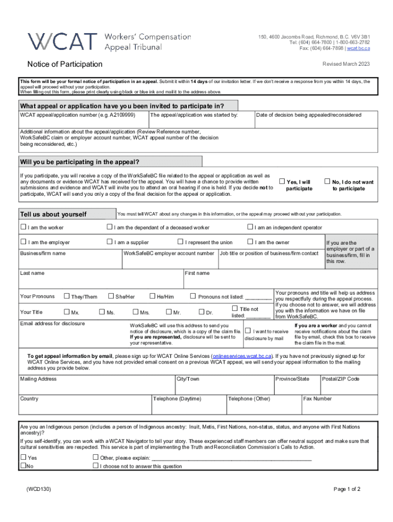 150, 4600 Jacobs Road, Richmond, B.C. V6V 3B1 Tel: (604) 6647800 | 18006632782 Fax: (604) 6647898 | what.bc.notice of ParticipationRevised March 2023This form will be your formal notice of participation