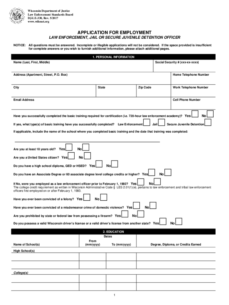 Wisconsin Department of Justice Law Enforcement Standards Board DJLE330, Rev. 5/2017 www.wilenet.orgAPPLICATION FOR EMPLOYMENT LAW ENFORCEMENT, JAIL OR SECURE JUVENILE DETENTION OFFICER NOTICE: All