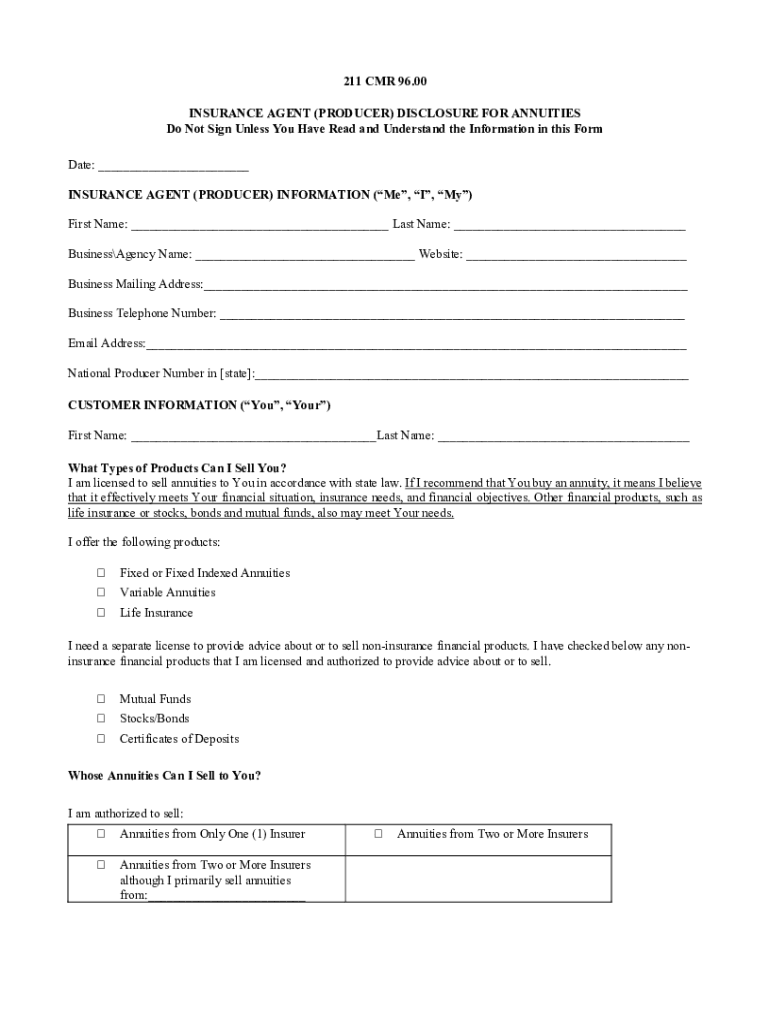 211 CMR 96.00 INSURANCE AGENT (PRODUCER) DISCLOSURE FOR ANNUITIES Do Not Sign Unless You Have Read and Understand the Information in this Form Date: ___ INSURANCE AGENT (PRODUCER) INFORMATION (Me,