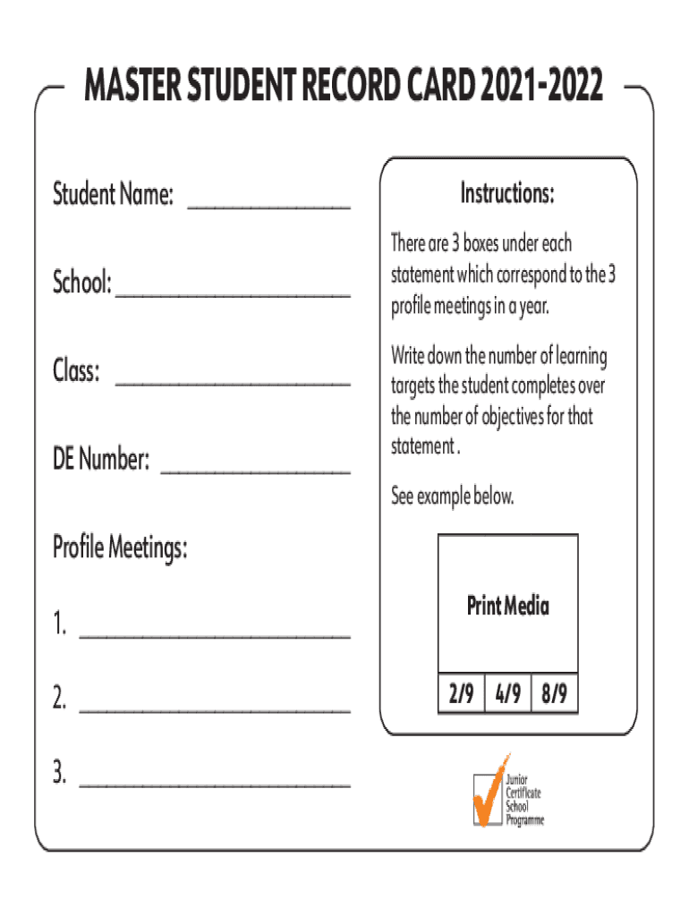 MASTER STUDENT RECORD CARD 20212022 Student Name: ___Instructions:School: ___There are 3 boxes under each statement which correspond to the 3 profile meetings in a year. Class: ___ DE Number: ___Write