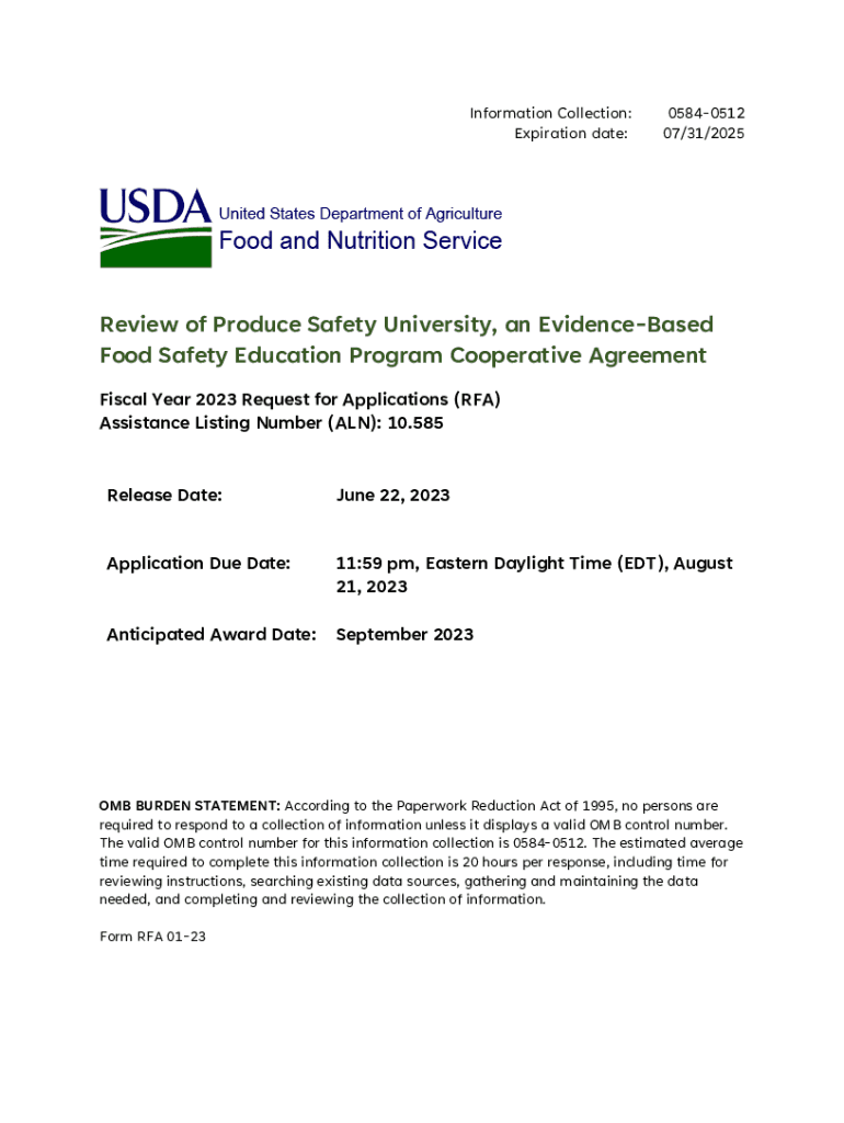 Information Collection: Expiration date:05840512 07/31/2025Review of Produce Safety University, an EvidenceBased Food Safety Education Program Cooperative Agreement Fiscal Year 2023 Request for Applications