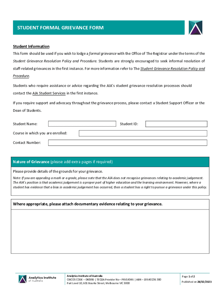 STUDENT FORMAL GRIEVANCE FORM Student Information This form should be used if you wish to lodge a formal grievance with the Office of The Registrar under the terms of the Student Grievance Resolution