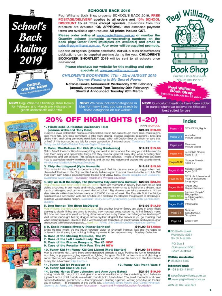 SCHOOLS BACK 2019 Peg Williams Book Shop presents SCHOOLS BACK 2019. FREE POSTAGE/DELIVERY applies to all orders and 10% SCHOOL DISCOUNT to all titles except specials. Selections from this brochure