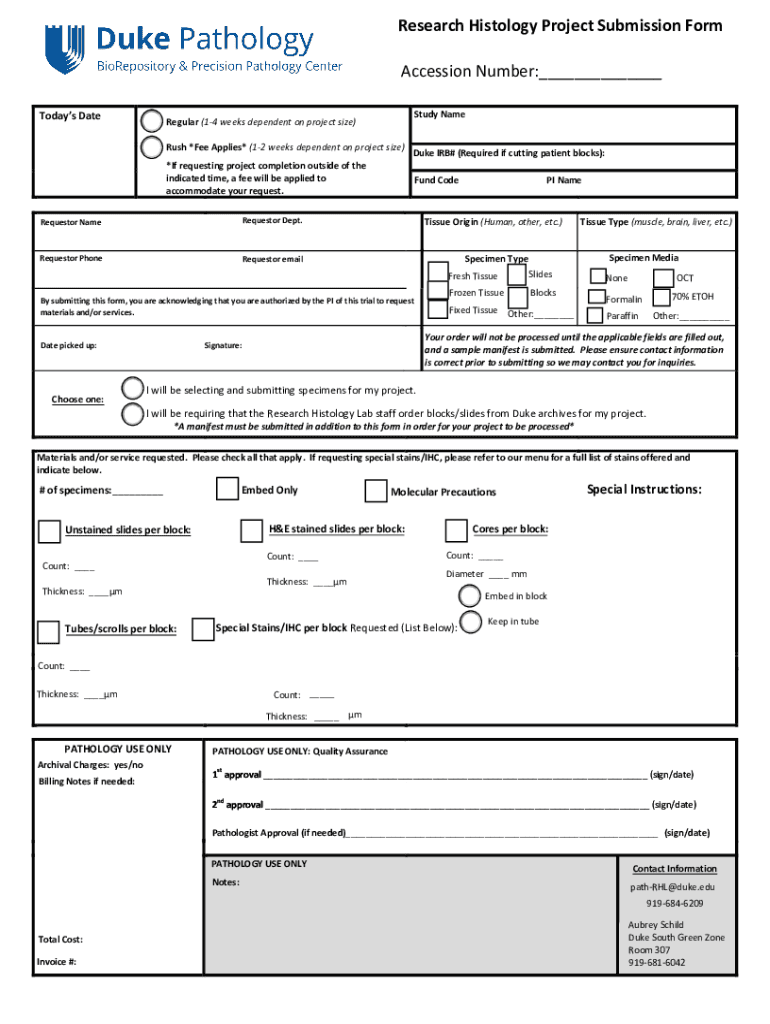 Research Histology Project Submission Form Accession Number:___ Today's Detested Semiregular (14 weeks dependent on project size) Rush *Fee Applies* (12 weeks dependent on project size) *If requesting