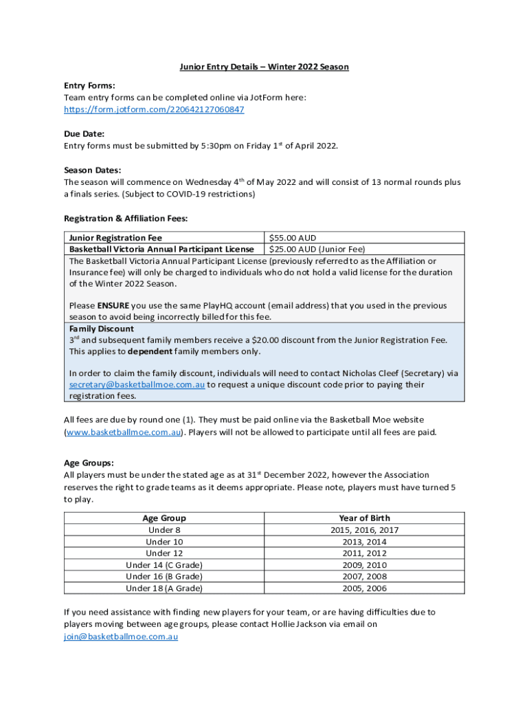 Junior Entry Details Winter 2022 Season Entry Forms: Team entry forms can be completed online via Conform here: https://form.jotform.com/220642127060847 Due Date: Entry forms must be submitted by