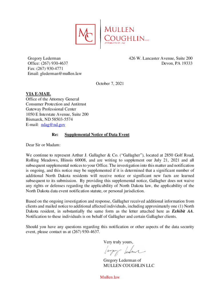 Gregory Alderman Office: (267) 9304637 Fax: (267) 9304771 Email: glederman@mullen.law426 W. Lancaster Avenue, Suite 200 Devon, PA 19333October 7, 2021 VIA EMAIL Office of the Attorney General Consumer