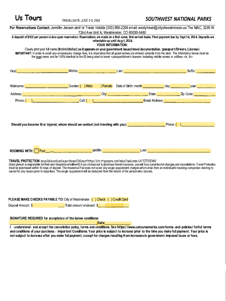 Us ToursSOUTHWEST NATIONAL PRE-TRAVEL DATE: JUNE 29, 2024For Reservations Contact: Jennifer Jensen and/ or Tracie Velouté (303) 6582294 email: westytravel@cityofwestminster.us The MAC, 3295 W72nd