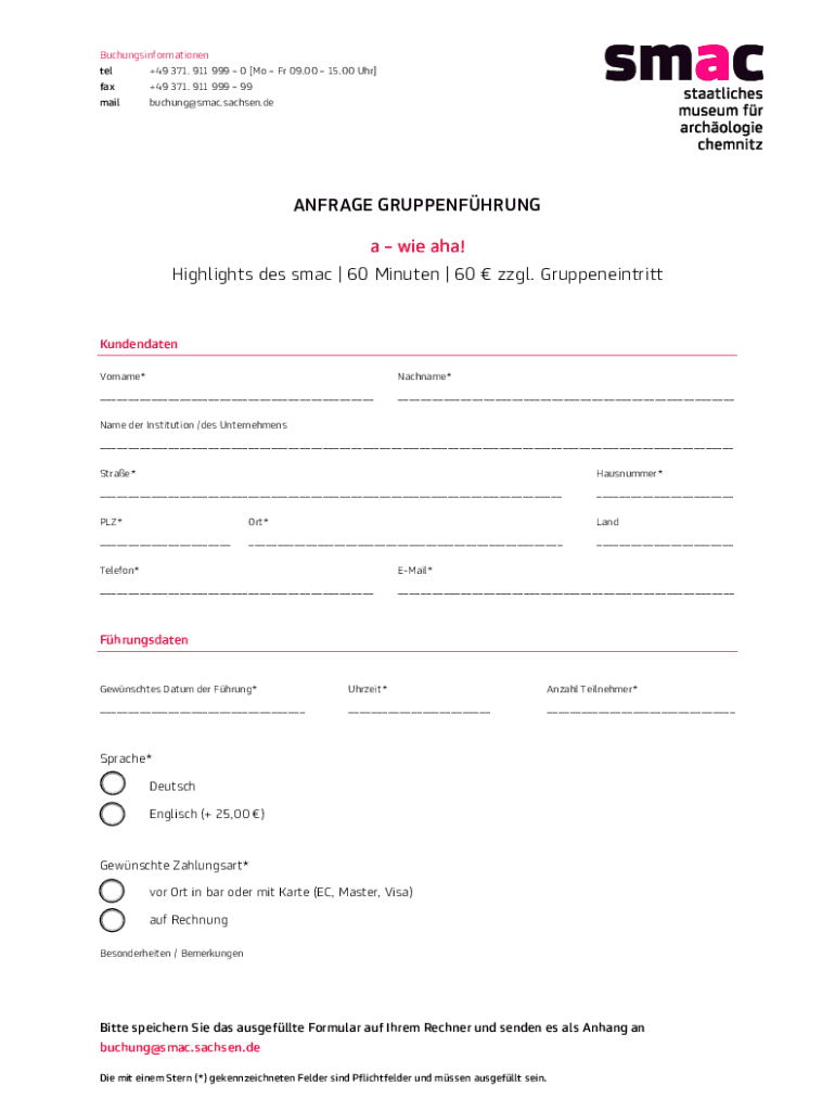 Buchungsinformationen tel +49 371. 911 999 0 [Mo For 09.00 15.00 UHF] fax +49 371. 911 999 99 mail buchung@smac.sachsen.deANFRAGE GRUPPENFHRUNG a aha! Highlights DES SMAC | 60 Minutes | 60 zeal. GruppeneintrittKundendaten