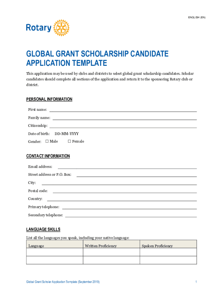ENGLISH (EN)GLOBAL GRANT SCHOLARSHIP CANDIDATE APPLICATION TEMPLATE This application may be used by clubs and districts to select global grant scholarship candidates. Scholar candidates should complete