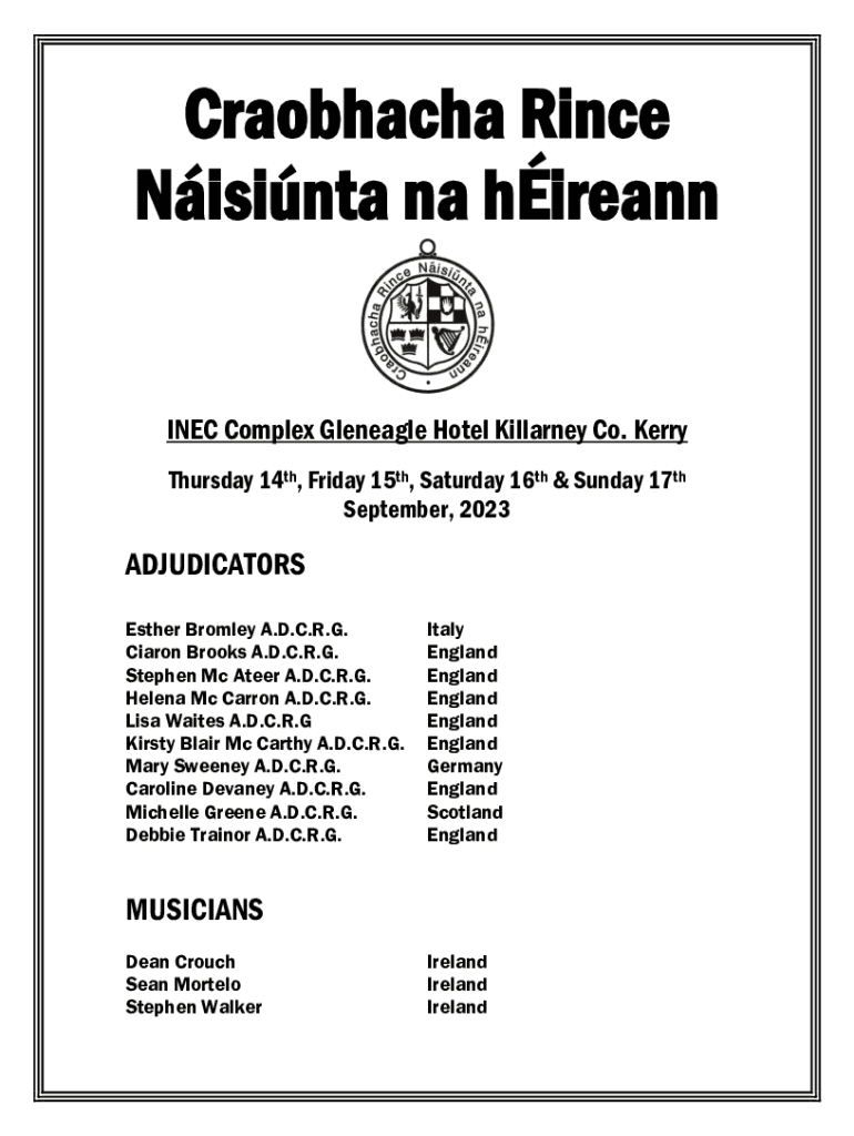 Craobhacha Since Nikita Na hireannINEC Complex Glen eagle Hotel Hillary Co. Kerry Thursday 14th, Friday 15th, Saturday 16th & Sunday 17th September, 2023ADJUDICATORS Esther Bradley A.D.C.R.G. Charon