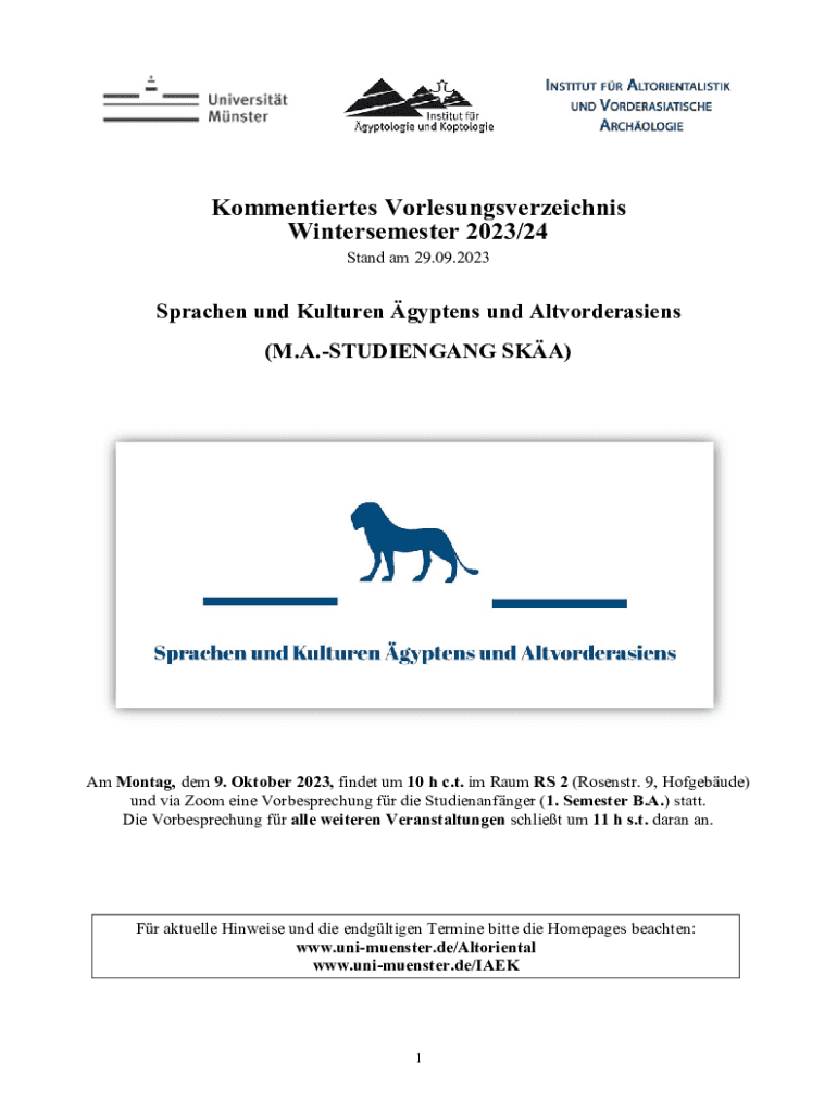 Commentaries Vorlesungsverzeichnis Winter semester 2023/24 Stand am 29.09.2023Sprachen UND Culture gyp tens UND Altvorderasiens (M.A.STUDIENGANG SKA)Am Montag, them 9. October 2023, finder um 10 h