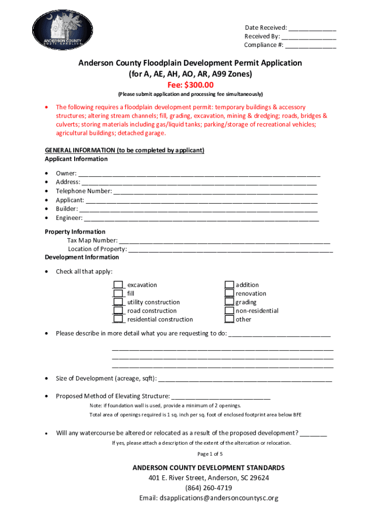 DEVELOPMENT STANDARDS Anderson County Floodplain Development Permit Application PacketNotice: This application is required for the development of the following in A, AE, AH, AO, AR, &A99 Zones. Temporary