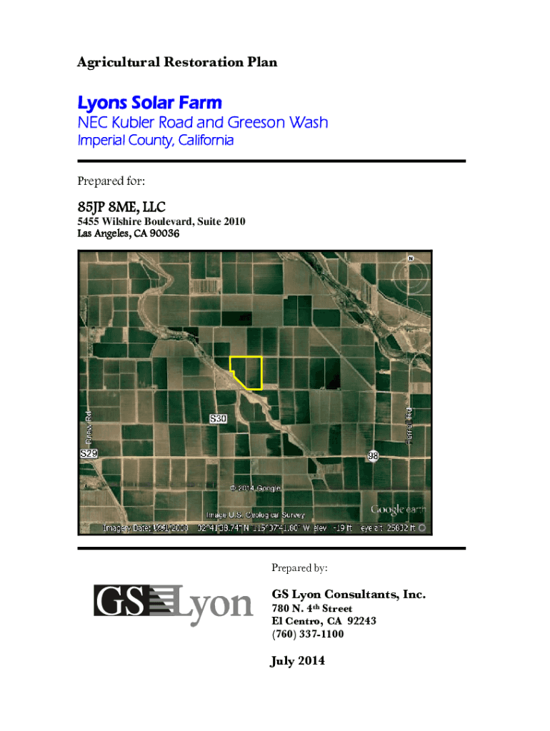 Agricultural Restoration Plan Lyons Solar Farm NEC Ruler Road and Gleeson Wash Imperial County, California Prepared for:85JP 8ME, LLC 5455 Wilshire Boulevard, Suite 2010 Los Angeles, CA 90036Prepared