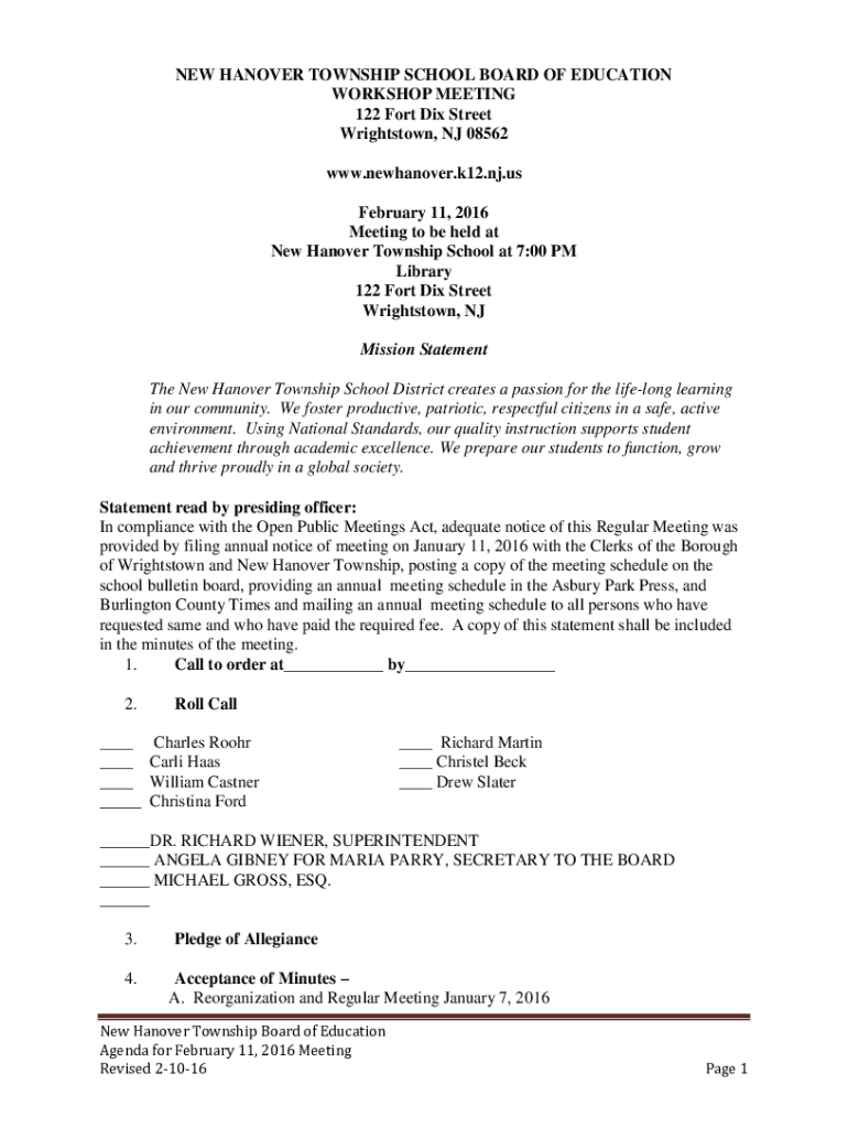 NEW HANOVER TOWNSHIP SCHOOL BOARD OF EDUCATION WORKSHOP MEETING 122 Fort Dix Street Wrights town, NJ 08562 www.newhanover.k12.nj.us February 11, 2016, Meeting to be held at New Hanover Township School